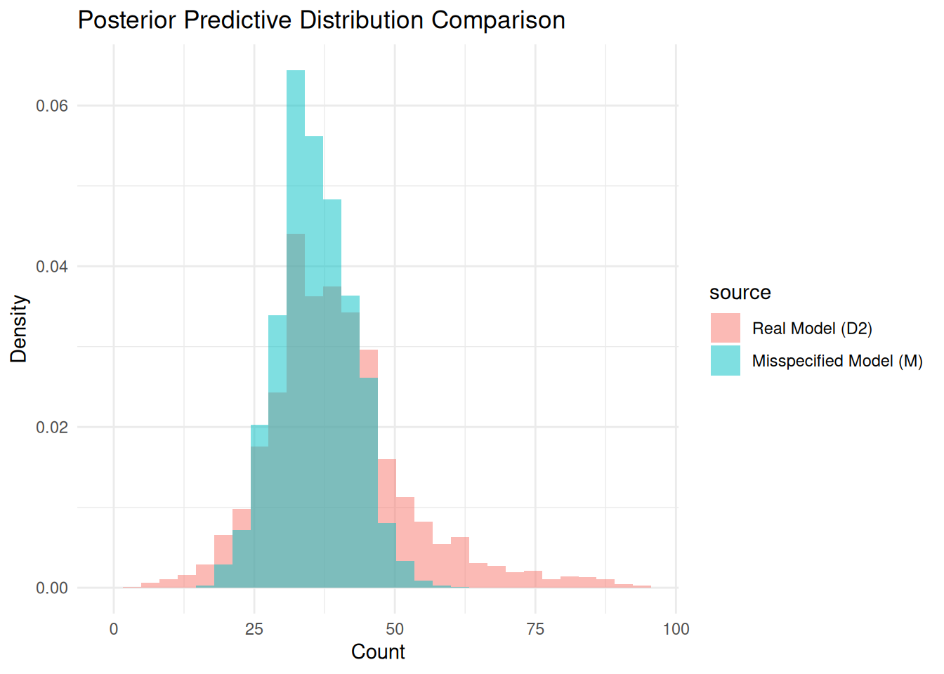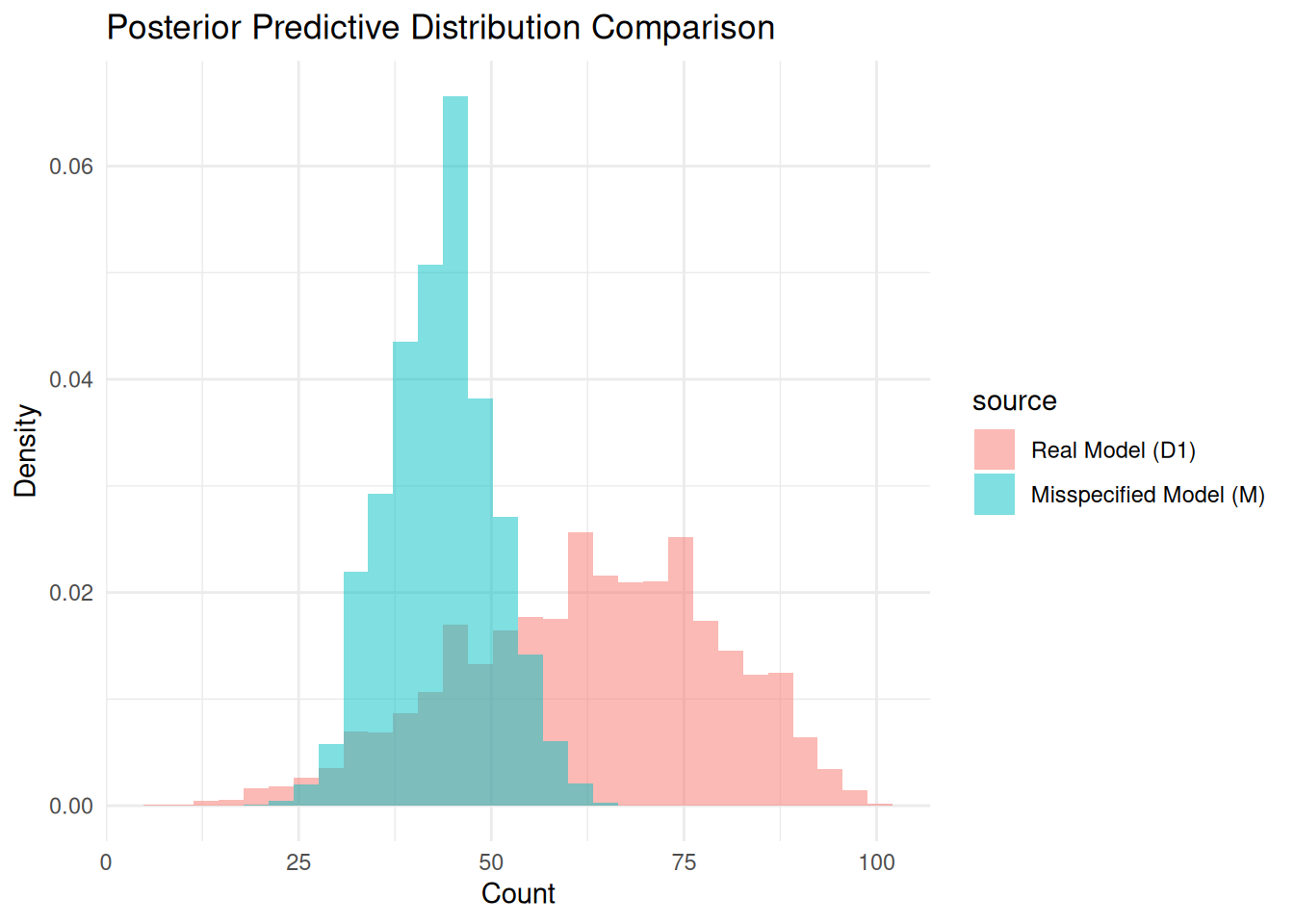 The posterior predictives are clearly different, with total variation distance 0.648 (a 14.4966443-fold increase over prior TVD). In this setup, misspecification has a meaningful effect on inference.